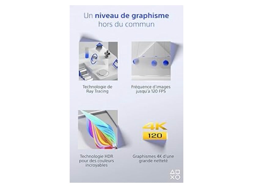 Rapide comme l'éclair, la PlayStation 5 fait tomber les barrières entre le virtuel et la réalité et vous embarque dans une toute nouvelle ère du jeu vidéo. Découvrez les temps de chargement extrêmement rapides offerts par un disque SSD ultra haute vitesse et faites l’expérience d’une incroyable immersion sensorielle grâce au retour haptique, aux gâchettes adaptatives et au son 3D. PlayStation 5, c’est aussi un catalogue passionnant de jeux PlayStation (non inclus) et une interface utilisateur réinventée pour un maximum d’instantanéité. Une toute nouvelle manière de jouer vous attend !